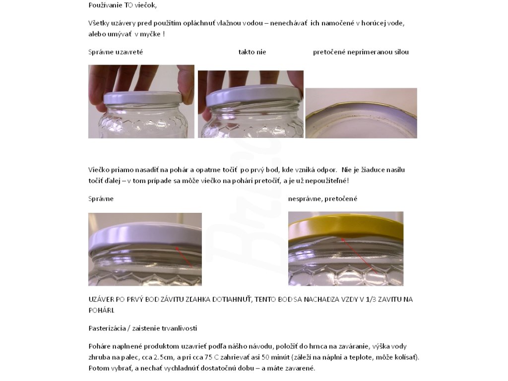 Na uzatváranie viečok je nevyhnutné použiť primeranú silu. Pri použití nadmernej sily môže dôjsť deformácií zúbkov, ktoré sa zapierajú o závitnicu na ústi pohára. Po úspešnom procese pasterizácie, alebo sterilizácie dôjde v vytvoreniu podtlaku, ktorý drží viečko.